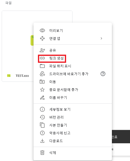 업로드한 파일에 마우스 오른쪽 클릭을 하고 메뉴에서 링크 생성을 클릭합니다.