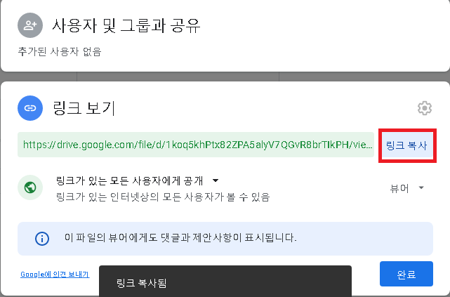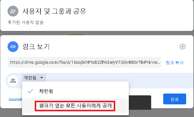 '제한됨'을 클릭하셔서 '링크를 모든 사용자에게 공개'로 바꿔주셔야 다른 사람들이 정상적으로
