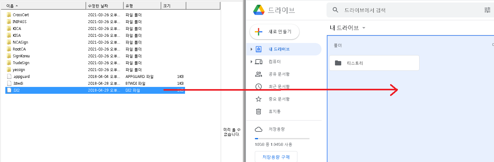첫번째 방법은 아래 사진과 같이 윈도우 탐색기를 열고 업로드할 파일이나 폴더를 구글 드라이브쪽에