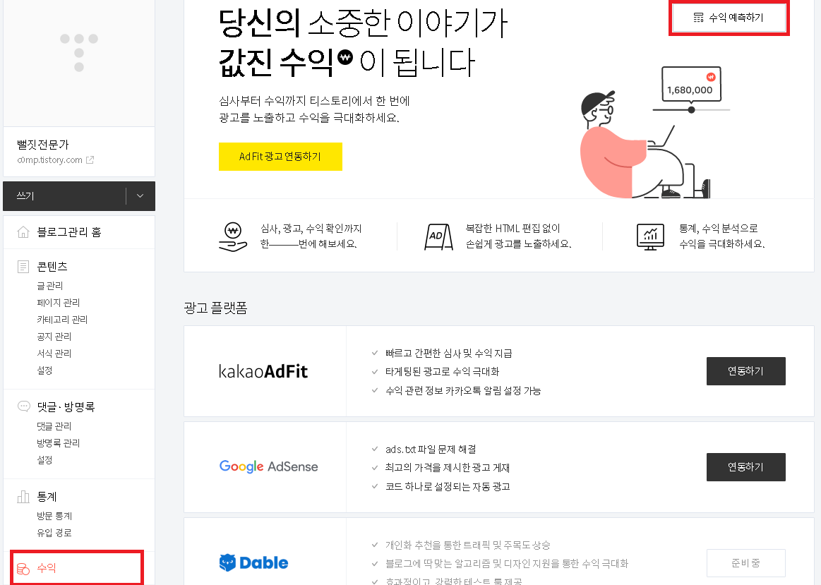 광고는 달지 않았지만 방문자수에 따른 수익을 예상해볼 수 있다