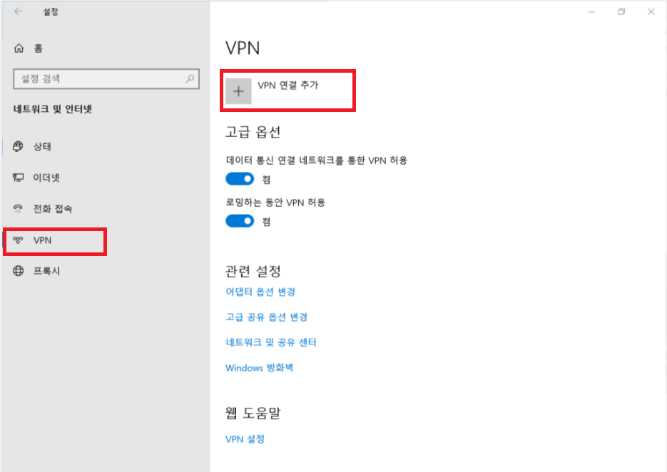 이제 윈도우에서 VPN 접속 설정방법입니다.