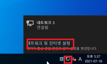 윈도우 창의 왼쪽하단에 컴퓨터 모양을 클릭하신후 '네트워크 밑 인터넷 설정'을 클릭합니다.