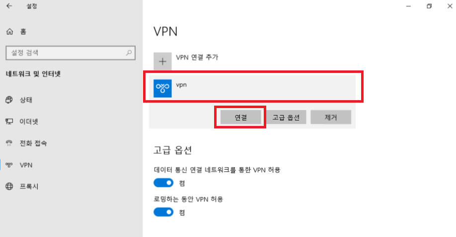 VPN이 정상적으로 등록됐다면 VPN이라는 메뉴가 생기며 이를 클릭하면 연결이라고 나옵니다.