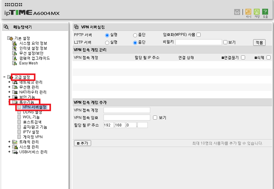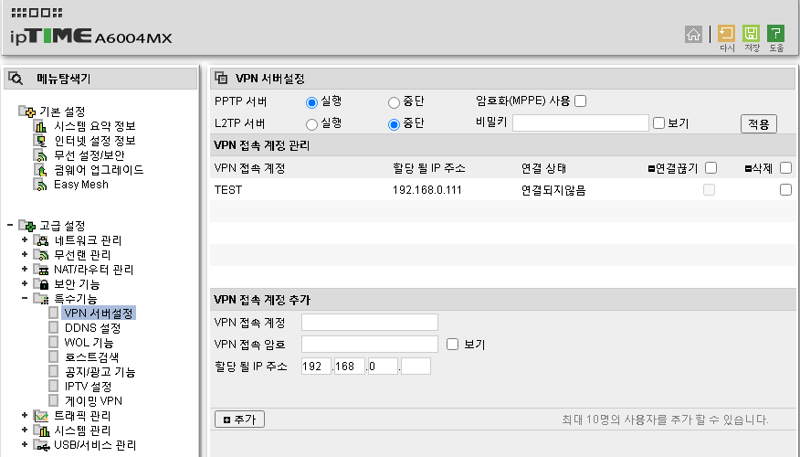 공유기의 왼쪽 메뉴에서 고급설정 -> 특수기능 - > VPN서버 설정을 순서대로 클릭하시면 VPN서버설정란이 나옵니다.