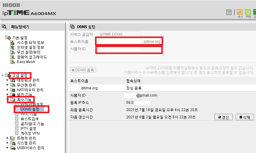 여기에서 호스트이름과 이메일형식으로된 사용자 ID를 입력하시고 'DDNS등록'을 클릭하면 아래 사진과 같이
