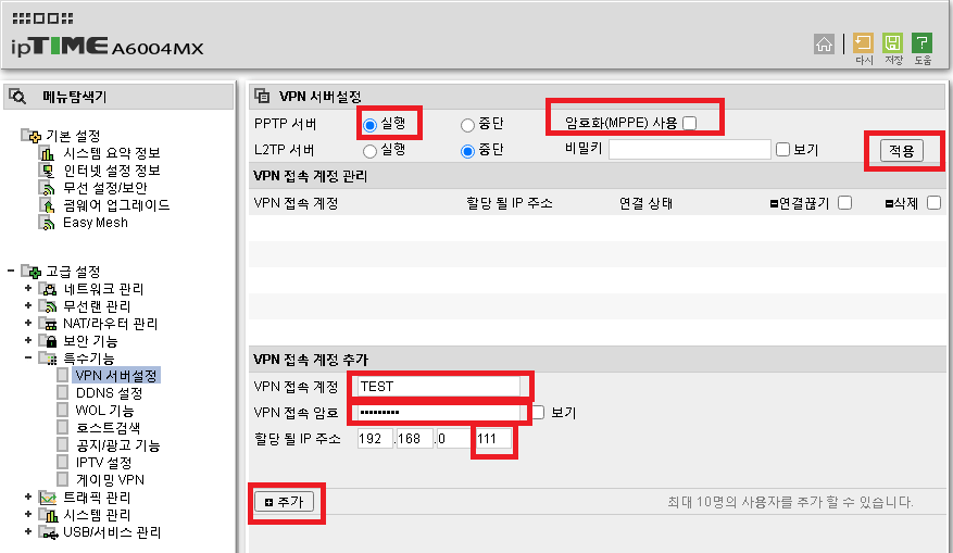 PPTP서버의 '실행'에 체크한 후 적용을 누릅니다.