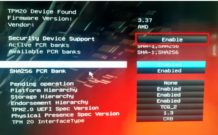 그 다음 아래 사진과 같이 'Security Device Support' 메뉴를 'Enable'로 바꿔줍니다.