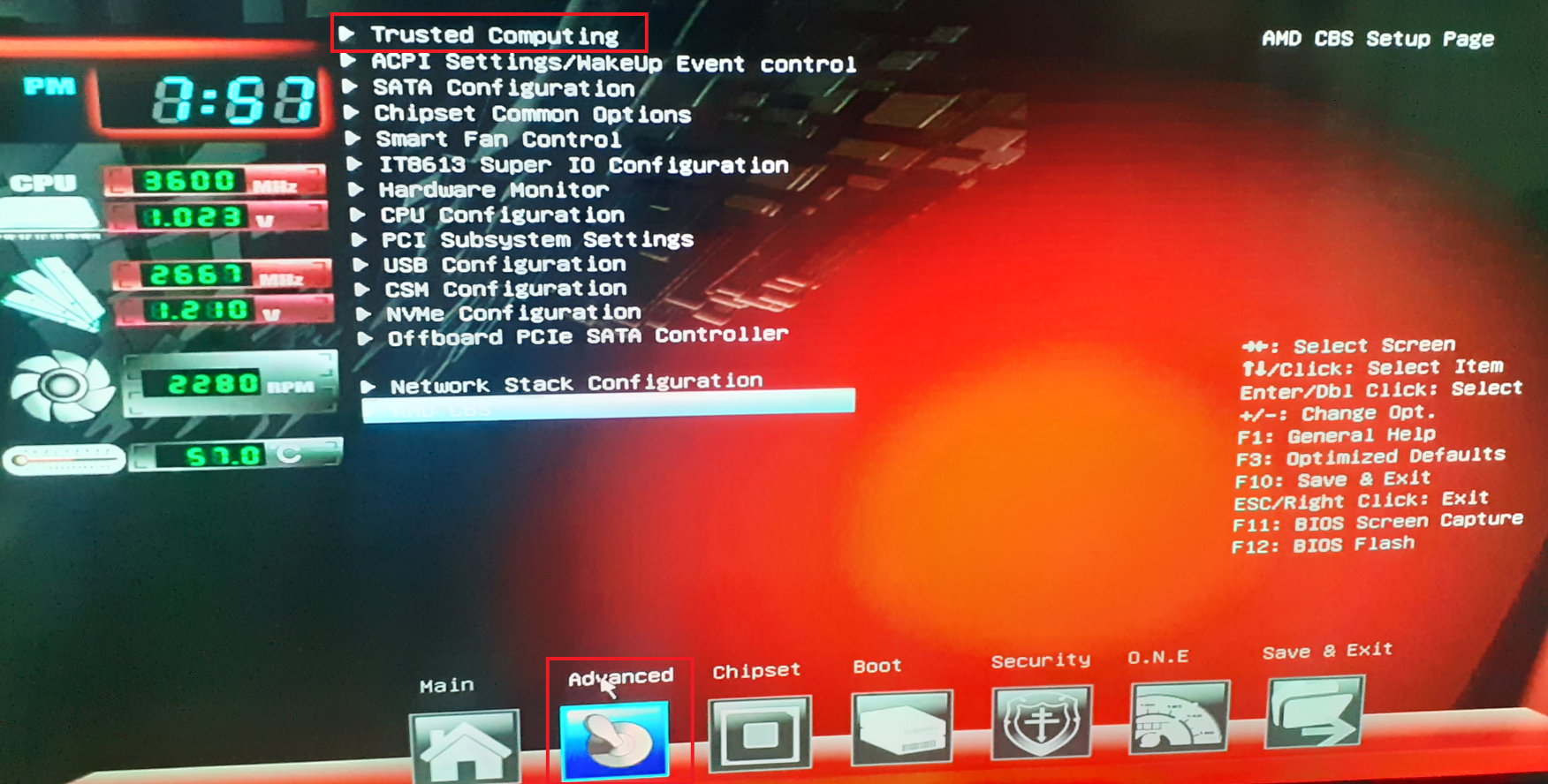 바이오스에 진입하면 아래쪽 메뉴에서 'Advanced'메뉴를 클릭하고 위쪽메뉴에서 'Trusted Computing'을 클릭합니다.