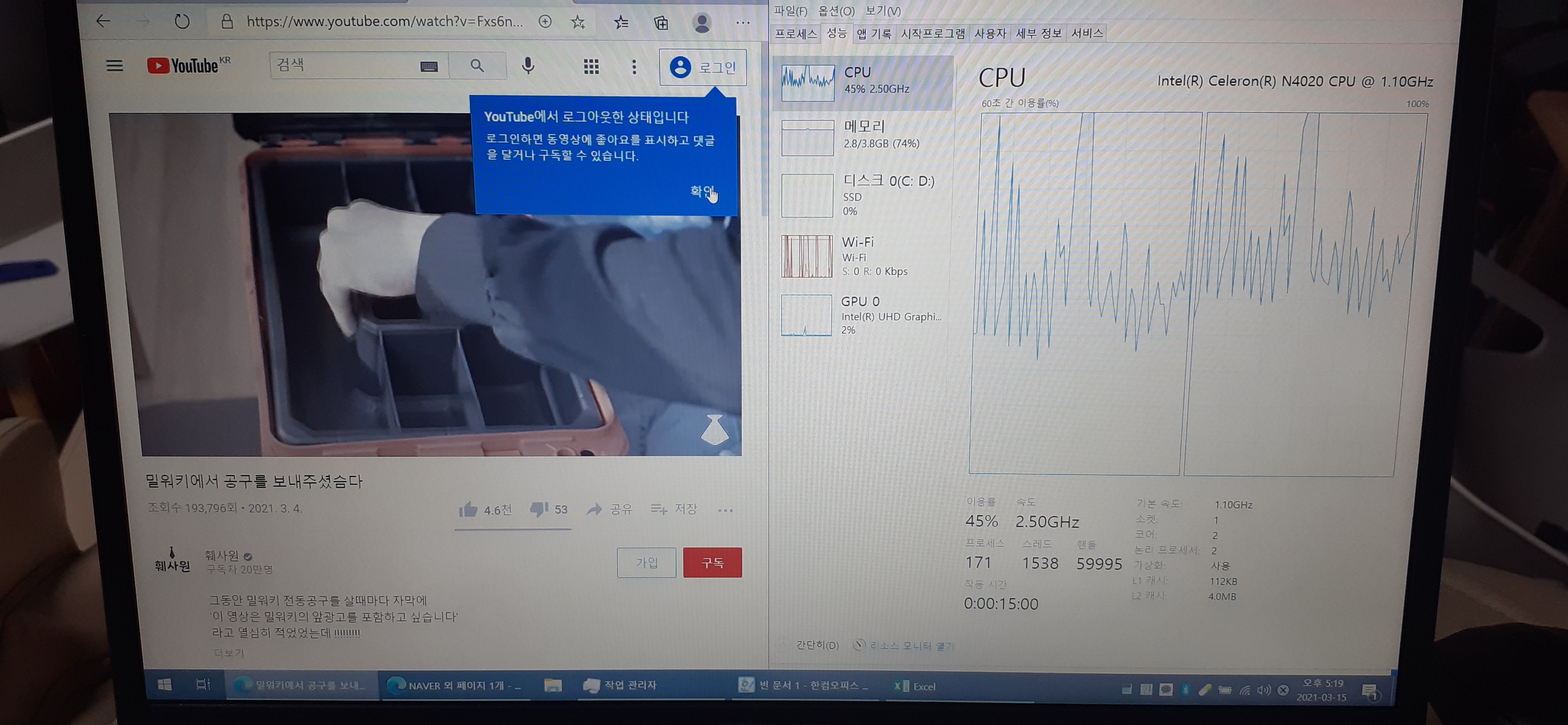 인터넷하고 문서작업하고 유투브만 보는지라 성능 좋은 노트북이 필요없음