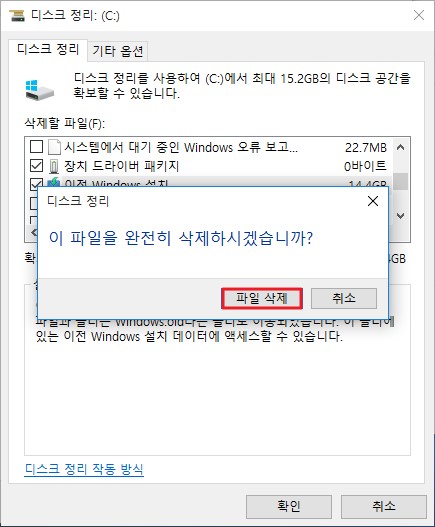 삭제할 파일 목록중 이전 Windows 설치 를 체크 후 확인 버튼을 누릅니다.