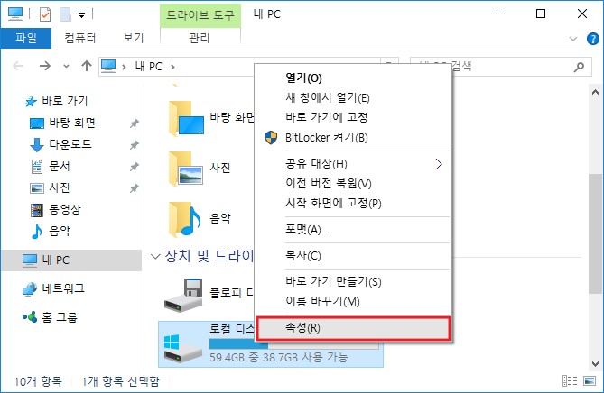 윈도우 탐색기를 연후 C드라이브를 마우스 오른쪽 클릭한 후 '속성'을 클릭합니다.