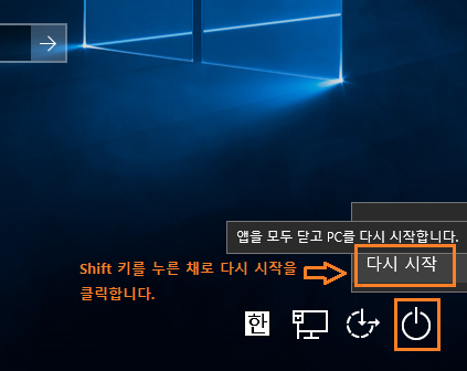 - 화살표 키로 이동하여 '다시 시작'으로 이동한 후 Shift 키를 누른채로 Enter 키를 누릅니다.