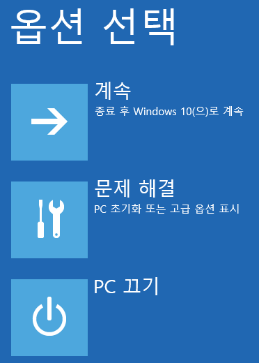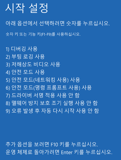 윈도우 로그인이 되지 않는 상태에서는, 로그인 화면 우측 하단의 전원아이콘을 클릭한 후 Shift 키를 누른채로 '다시 시작' 을 클릭하고 4번부터 진행합니다.)