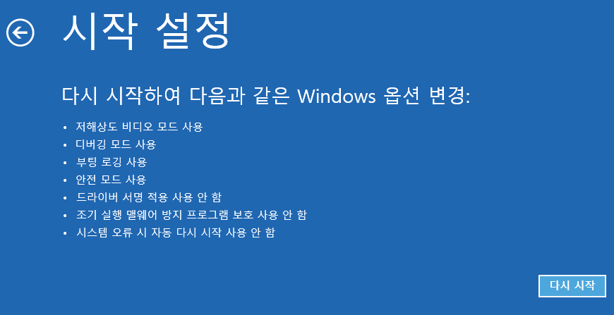 - 시작 설정 창에서 다시 시작 버튼을 클릭합니다.