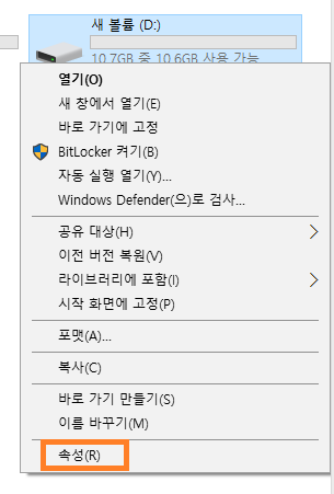 - 탐색기를 열고 외장 하드 드라이브를 마우스 오른쪽 버튼으로 클릭한 후 속성을 클릭합니다.