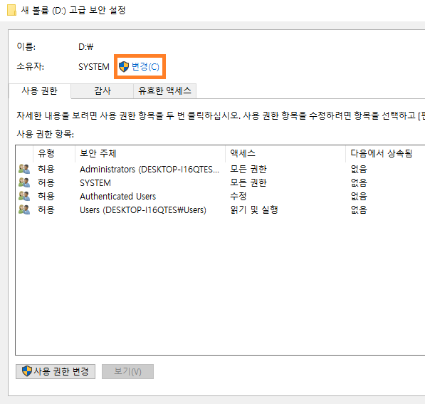- 고급 보안 설정 창이 나타나면 소유자 항목의 "변경"을 클릭합니다.