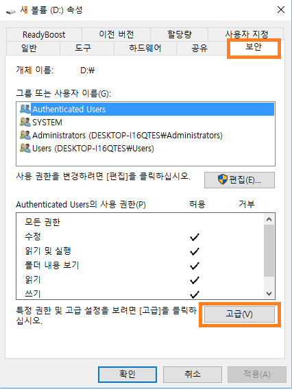 - 속성 창에서 보안 탭으로 이동한 후 고급 버튼을 클릭 클릭합니다.