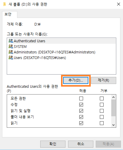 - 다시 드라이브를 마우스 오른쪽 버튼으로 클릭하여 [속성 - 보안 탭]으로 이동한 후 사용 권한 창의 보안 탭에서 편집 버튼을 클릭하고 추가 버튼을 클릭합니다.