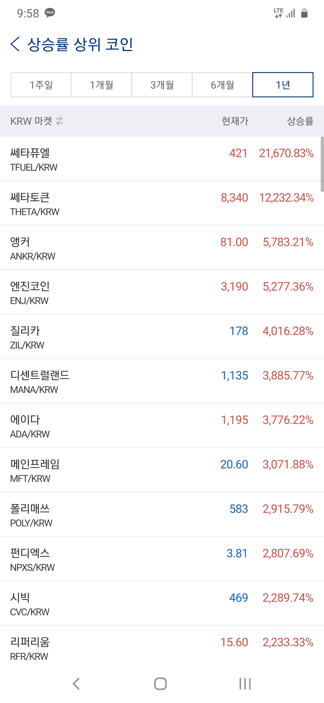 최근 1년간 가상화폐(코인) 상승률 순위입니다