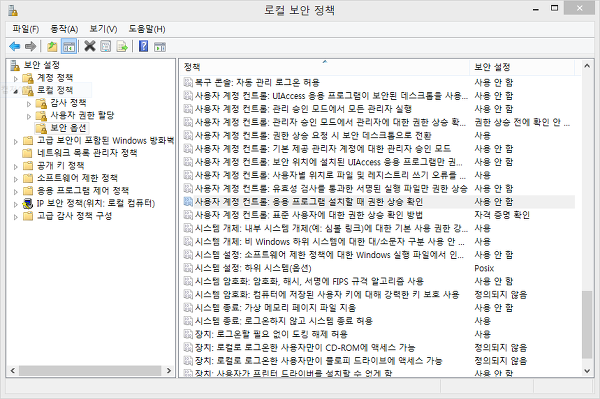 a. 사용자 계정 컨트롤: 응용 프르그램 설치할 때 권한 상승 확인-사용안함