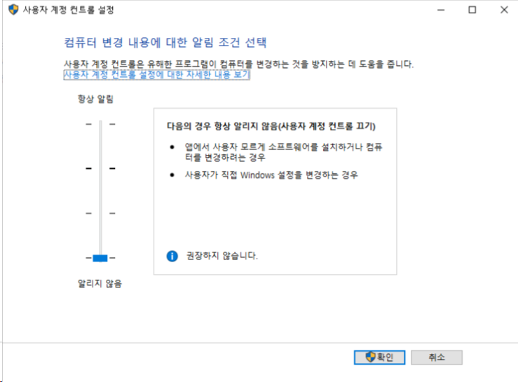 윈도우10 제어판에서 아래 사진과 같이 사용자 계정 컨트롤 설정에서 컴퓨터 변경내용에 대한 알림조건을