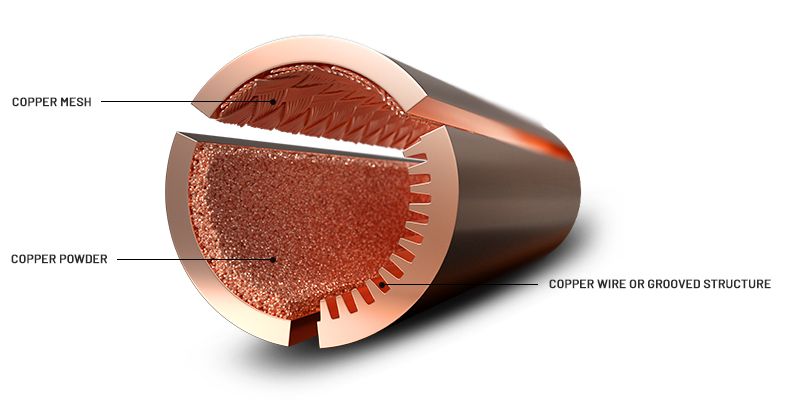 히트파이프의 내부 구조는 대표적으로 3가지가 존재하며, 위 예시 이미지에서 나온대로 먼저 금속 가루를 소결시킨 파우더