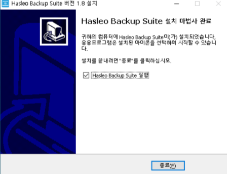 설치가 완료되었습니다. 종료 버튼을 누르면 설치창이 사라지고 백업수트 프로그램이 실행됩니다.