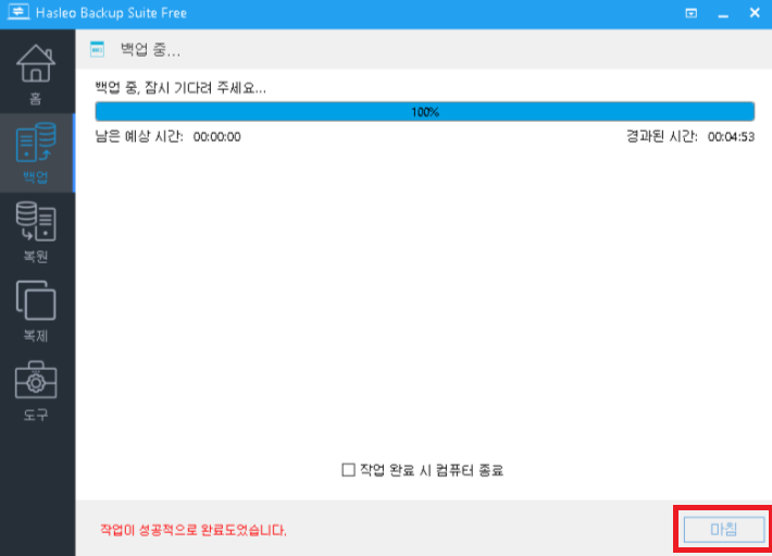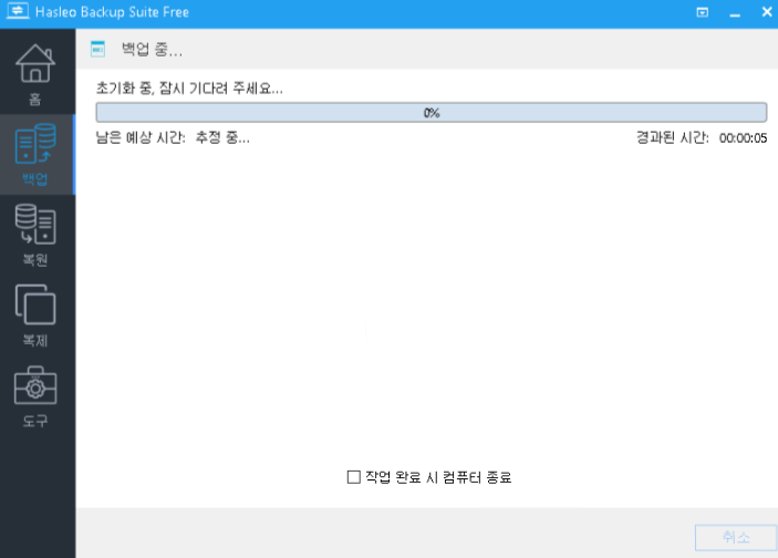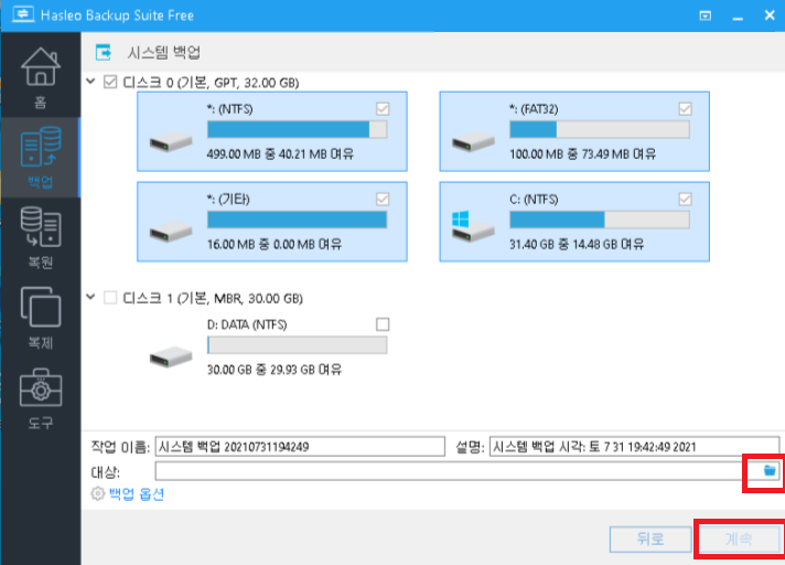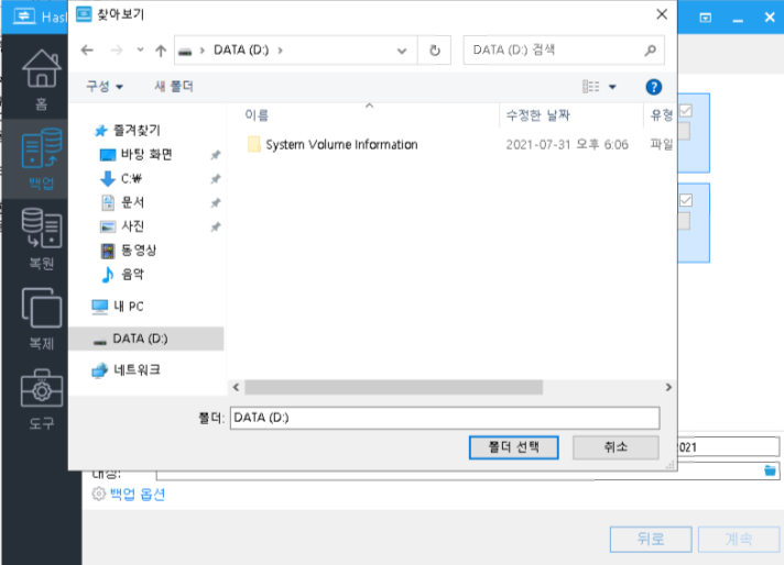폴더를 선택한 후 '계속'을 선택하면 백업진행창이 나오면서 백업작업이 시작됩니다.