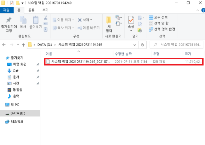 백업이 완료되면 아래 사진과 같이 백업폴더로 지정한 D드라이브에 백업이미지 파일이 생성되었는지 확인해 봅니다.