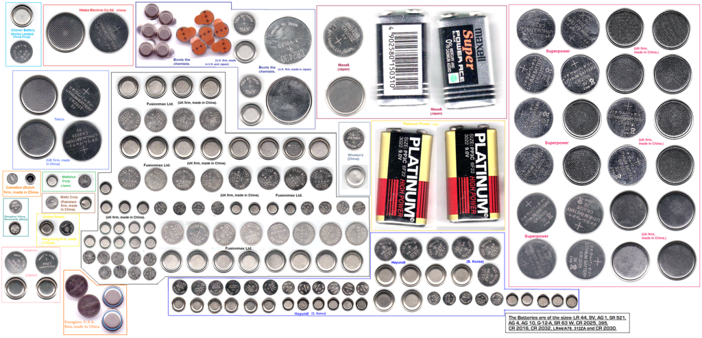 이외에 손목시계에는 SR과 LR 규격이 많이 쓰입니다.LR은 양극이 이산화망간, 전해질이 알칼리, 음극이 아연인 알칼라인 배터리이며 전압은 1.5V입니다SR은 양극이 은, 전해질이 알칼리, 음극이 아연인 알칼라인 배터리이며 전압은 1.55V입니다.LR / SR 건전지의 표기법은 4자리인경우는 일반 리튬전지와 같이 앞2자리가 지름이며 뒤 2자리는 두께입니다.3자리의 경우 앞에 1자리가 지름이며, 뒤 2자리는 두께입니다.
