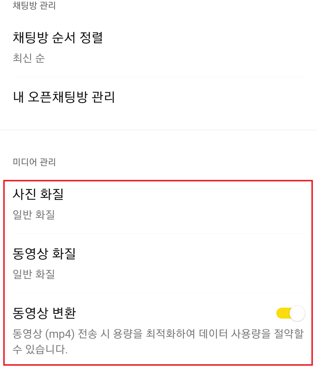 채팅 설정 메뉴가 뜨면 중간에 사진 화질과 동영상화질, 동영상 변환을 설정하는 메뉴가 보입니다.
