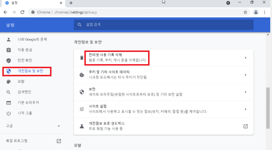 설정 페이지에서 '개인정보 및 보안' 항목을 클릭후 '인터넷 사용 기록 삭제'를 클릭합니다.