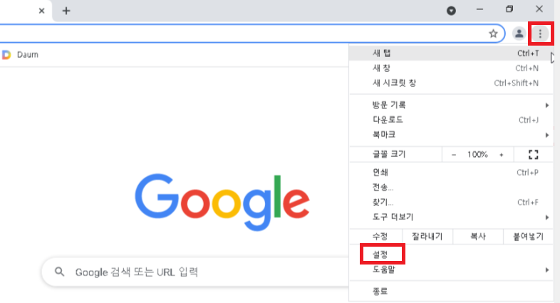일단 크롬을 실행하고 오른쪽 상단의 ... 메뉴를 클릭해 드롭다운 메뉴에서 '설정'을 클릭합니다.