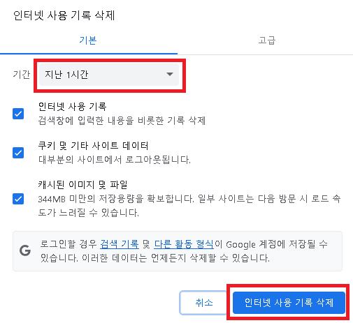 해당기간에 저장된 인터넷 사용기록이 삭제됩니다.