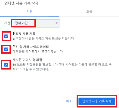 아래와 같이 인터넷 사용 기록 삭제 창이 뜨면 기간에는 '전체기간'을 선택하고