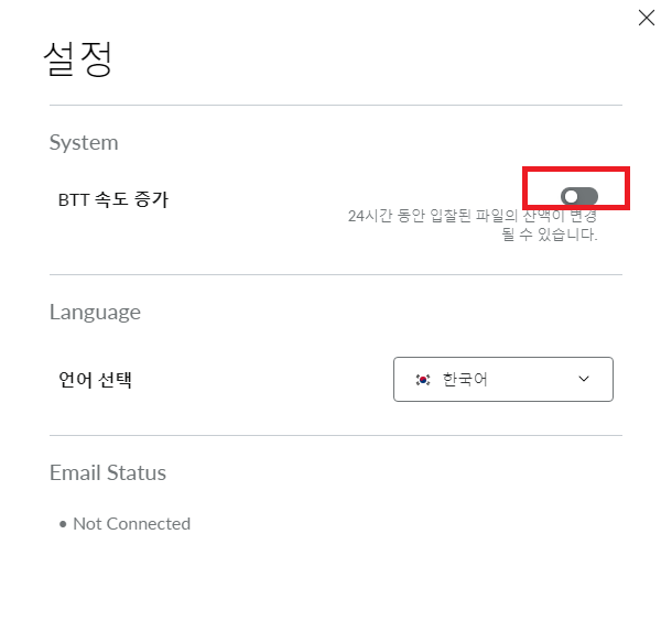 설정창이 뜨면 아래사진과 같이 BTT 속도 증가 옵션을 끄면 됩니다.