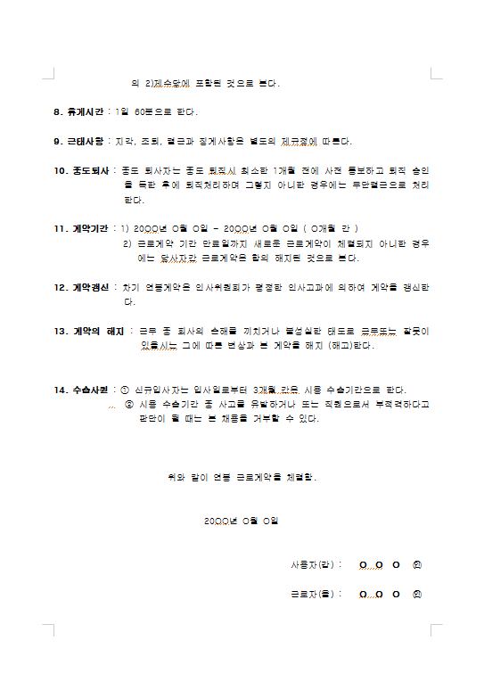 계약서에는 계약 당사자인 사용자와 근로자의 인적사항과 근무부서, 직위, 급여조건,