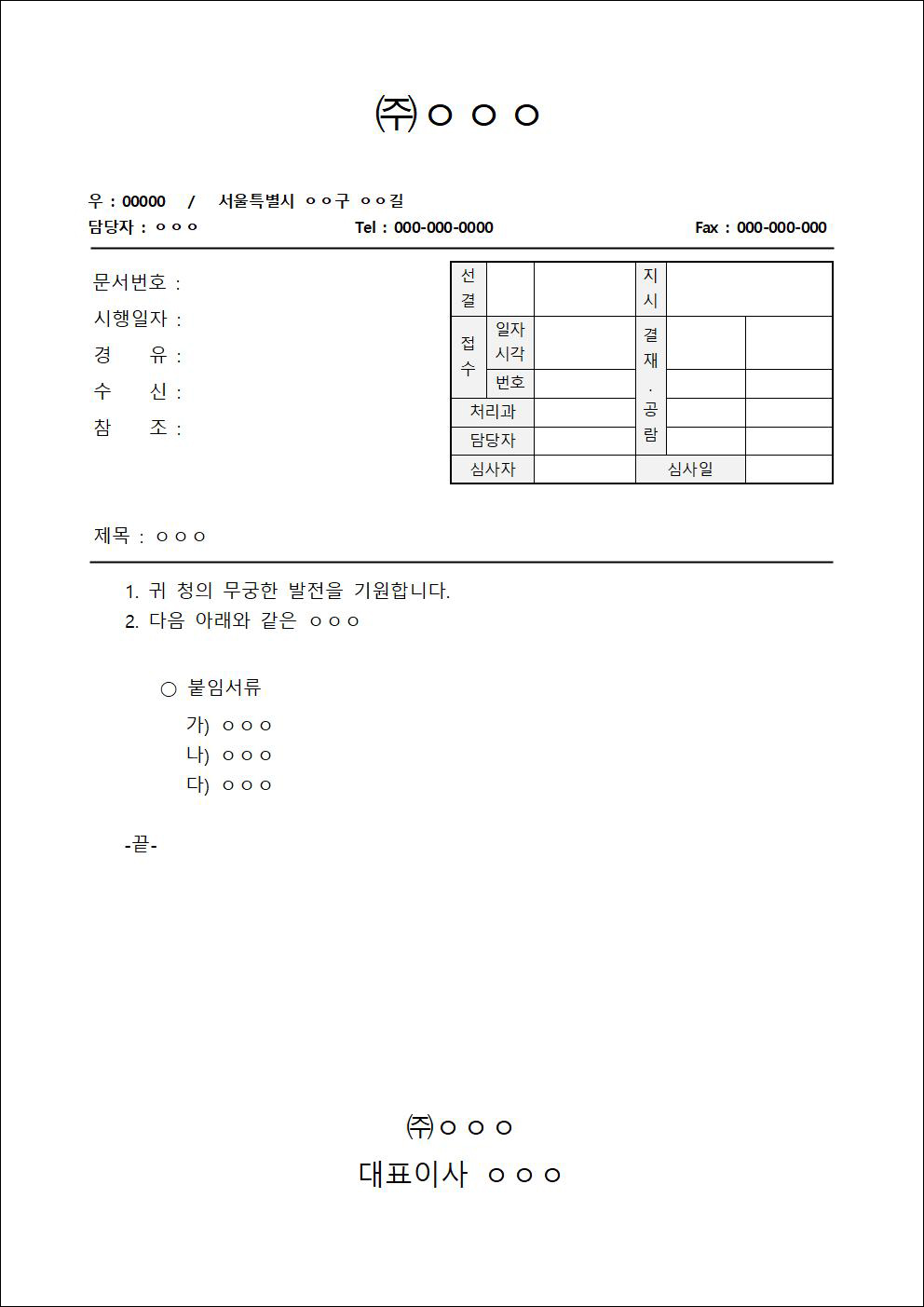 공문서는 회사나 단체의 주소, 우편번호, 전화번호, 팩스번호, 문서번호, 수신, 결재란 등의