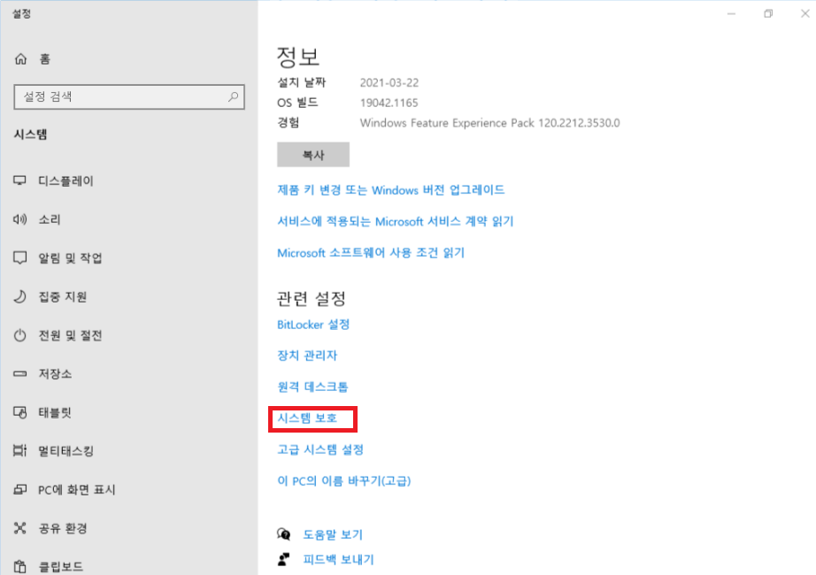 설정창이 열리면 '시스템 보호'를 선택합니다.