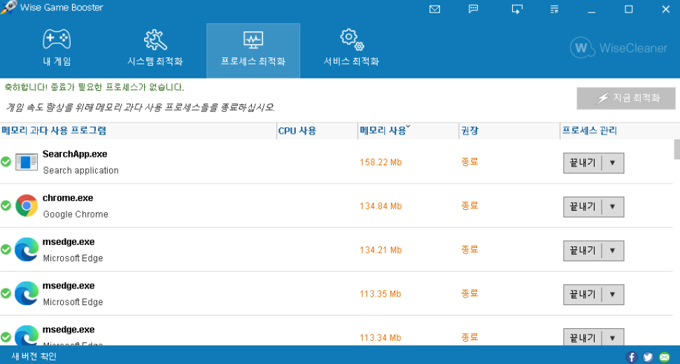 Process Optimizer 및 Services Optimizer 섹션에서 Wise Game Booster를