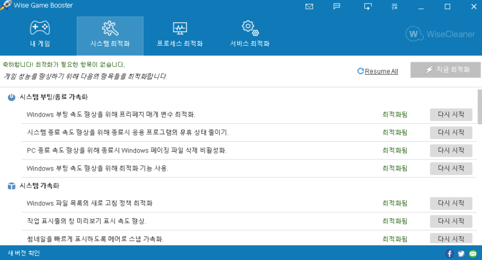 Wise Game Booster의 시스템 최적화는 관련 시스템 설정을 최적화하여