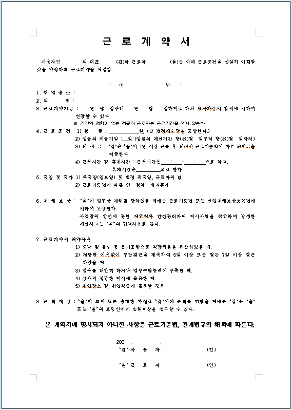 | 무기계약직 표준 근로계약서 무료 양식 서식(한글) (0) | 2021.09.05 |