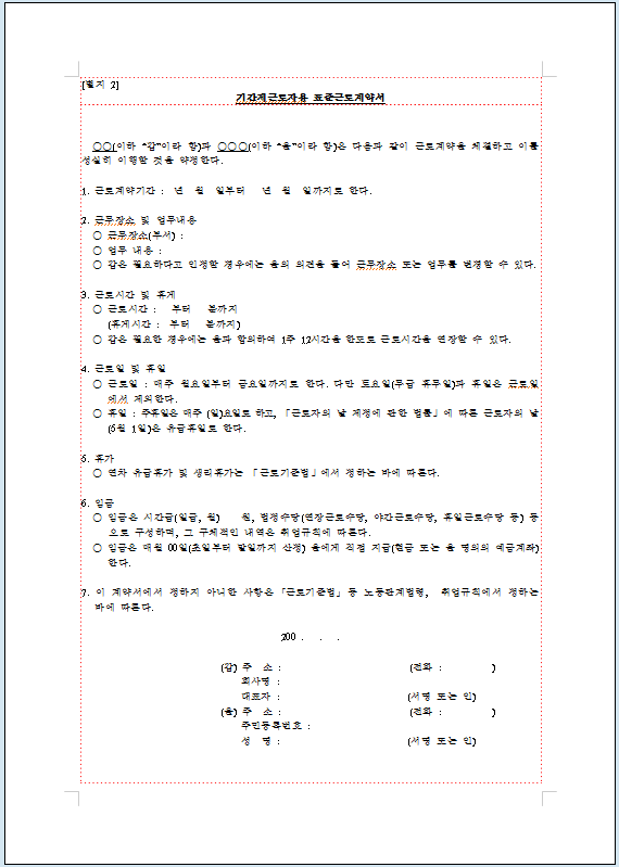 | 무기계약직 표준 근로계약서 무료 양식 서식(한글) (0) | 2021.09.05 |