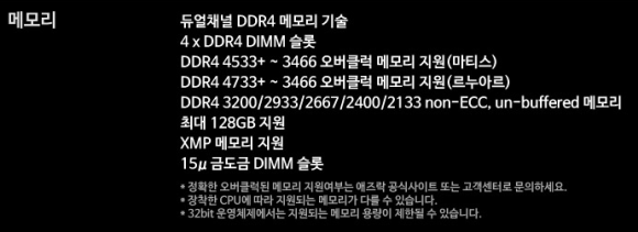아래 사진은 메인보드 상품설명을 발췌한 것으로 어떤 종류의 램을 지원하며
