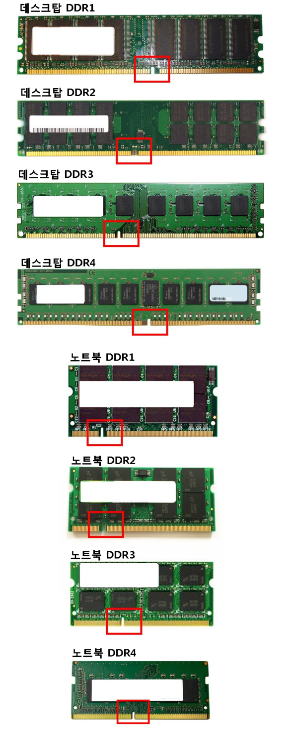 메모리 사이즈는 동일하며 메인보드에 꼽히는 슬롯부분의 홈이 각 세대마다