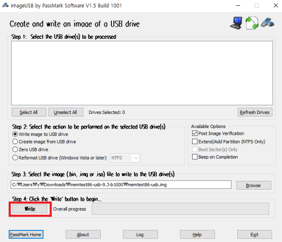 'Write'를 클릭하면 Memtest86 부팅 usb가 만들어집니다.