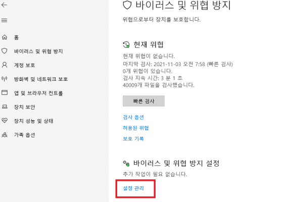 위에 설명한 2가지 방법으로 바이러스 및 위협 방지 페이지에 들어가면 페이지