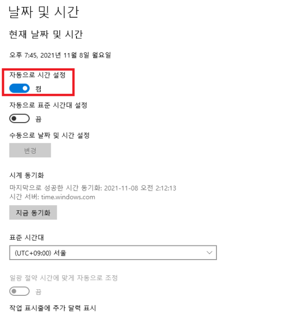 위 사진과 같이 '자동으로 시간 설정'이 '켬'으로 설정되어 있다면
