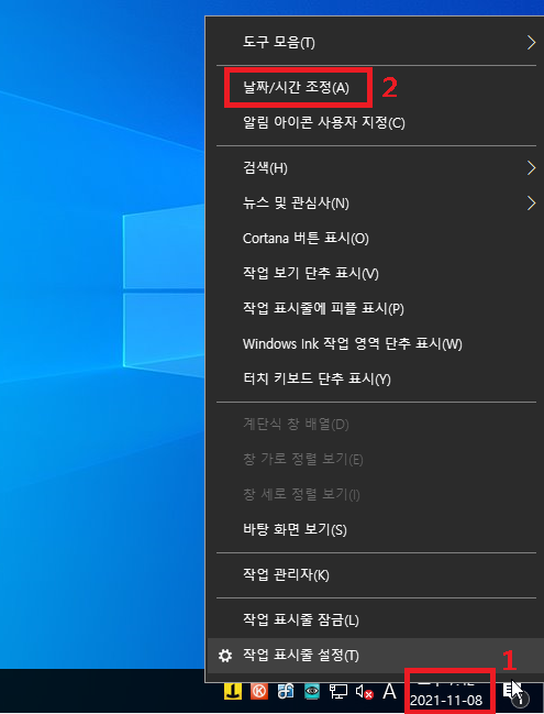 일단 위 사진과 같이 작업표시줄 제일 오른쪽의 날짜와 시간이 나오는 곳에
