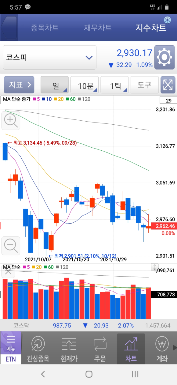 10월초에는 많이 떨어졌으며 이후 3000선에서 왔다갔다합니다.